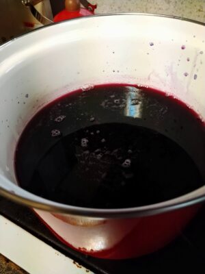 ここで黒に近い青紫色の煮汁がきれいな赤紫色に変わるのがミソ。